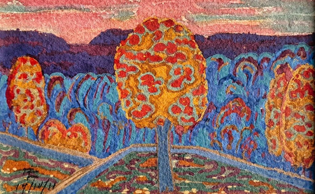 The painting depicts a richly coloured landscape characterised by an expressive, almost mosaic-like brushwork. In the foreground are three striking trees with bright red and orange leaves, standing out against a background of deep blue and violet hills. The sky is rendered in warm pink and peach tones and contrasts sharply with the cool colours of the landscape. The colour composition and the abstracted depiction of nature create a dynamic, vibrant atmosphere that is typical of Evard’s modern, expressionist works.