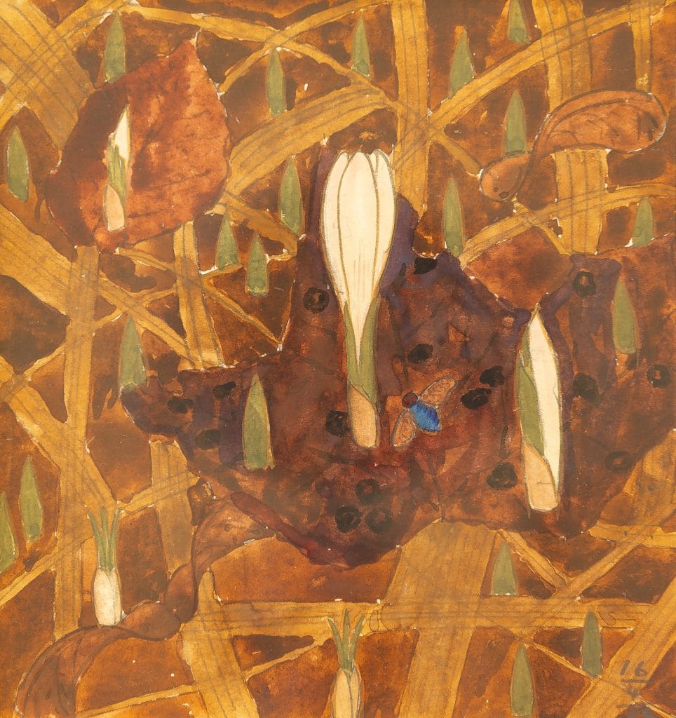 The work presents a dense, almost ornamental composition of plant structures that fills the entire pictorial space. The colour palette is dominated by warm, earthy browns, reminiscent of withered autumn leaves, damp soil and yellowed grass. This background structure appears like an interwoven network of leaves, stems and grasses, rendered in a wide range of shades of ochre, sienna and dark brown. Rising from this dense, organic ground are several narrow, elongated flower forms. They are set in lighter, almost whitish-cream tones and thus appear as delicate accents of light within an otherwise dark ensemble. Their slender, upward-pointing silhouettes create a vertical tension in the image. Alongside them, smaller greenish elements appear, generating additional movement and depth. Individual dabs of vivid blue or black create minimal yet effective contrasts that guide the viewer’s eye through the composition.