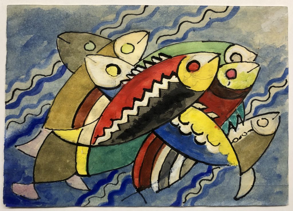 Fische, 1957, Öl auf Hartfaserplatte, 50 x 65 cm