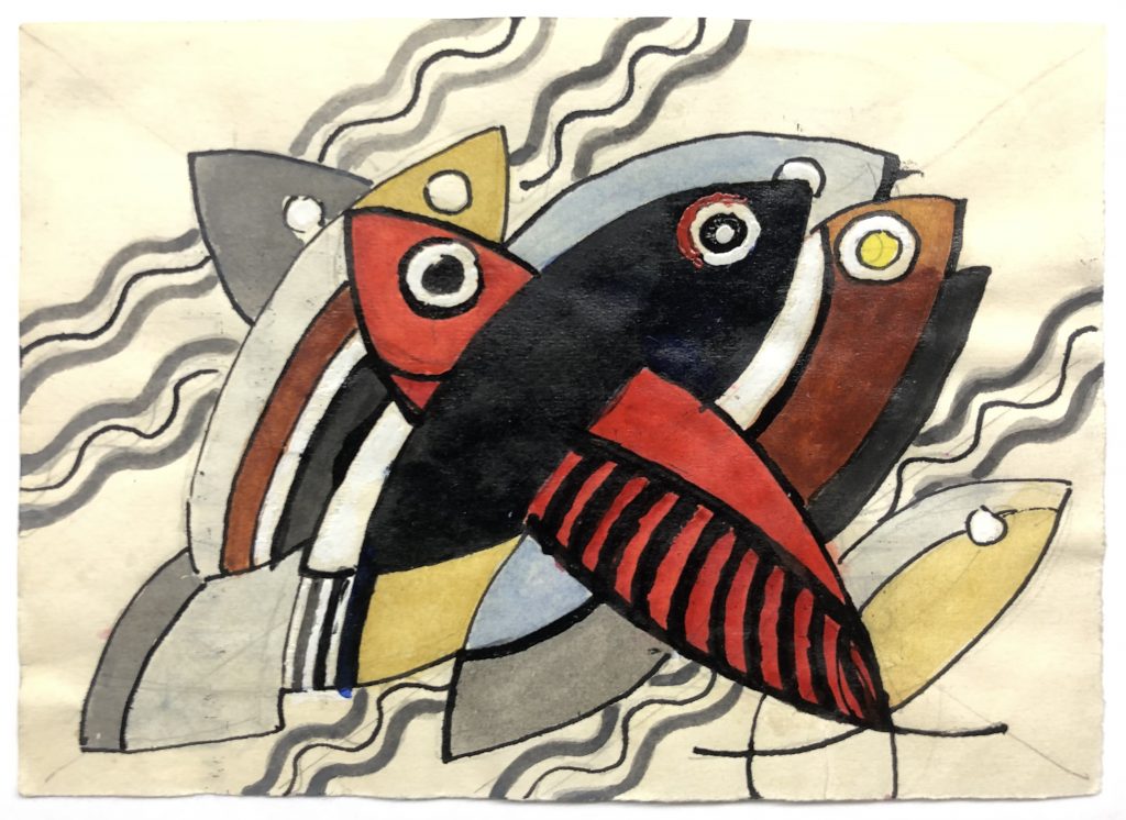 In seinem Werk „Fische“ aus dem Jahr 1957 (50 x 56 cm) zeigt André Evard eindrucksvoll seine Fähigkeit, Figürliches in eine klare, abstrakte Formensprache zu übersetzen. Mehrere stilisierte Fische sind in dynamischer Bewegung dargestellt, eng aneinandergereiht und durch prägnante schwarze Konturen voneinander abgegrenzt. Trotz der Reduktion auf einfache geometrische Formen bleibt das Motiv deutlich erkennbar und erhält durch die rhythmische Anordnung eine beinahe musikalische Komposition.