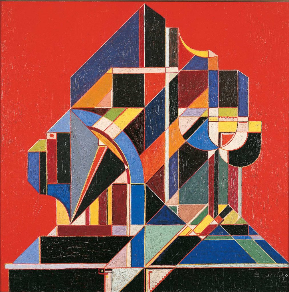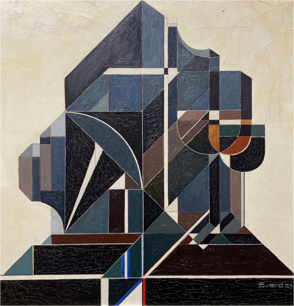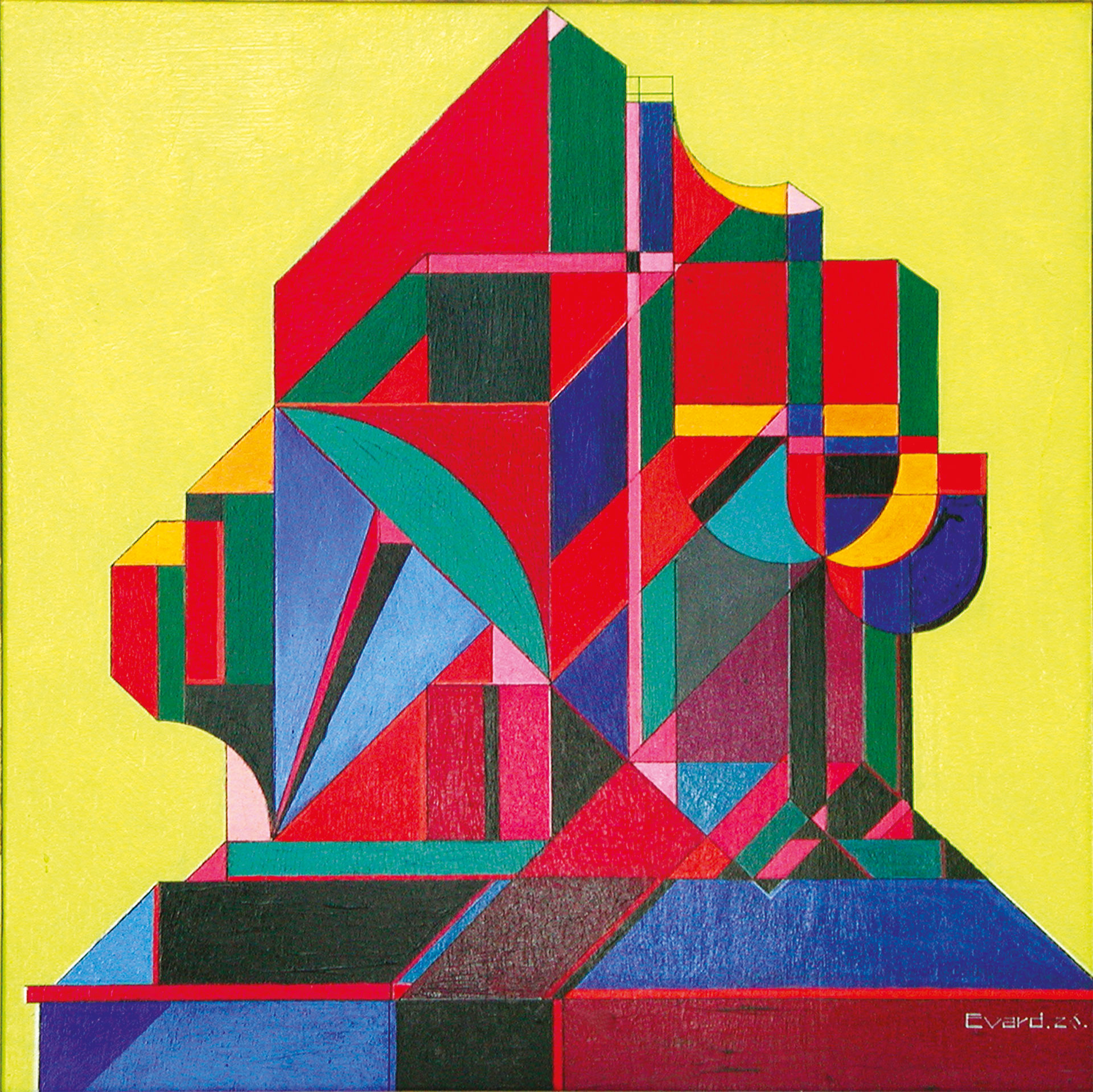 Vor einem monochrom roten Hintergrund türmt sich diese farbenprächtige Komposition von 1925 auf. Sie gehört zu einer Serie aus drei Bildern, in denen Evard das gleiche Motiv aufgreift, jedoch verschiedene Farbgebungen wählt. Zudem besteht eine enge Verwandtschaft mit der Symphonia-Serie. Für dieses Bild bedient sich Evard einer reichen Farbpalette. Durch die Schwarz- und dunklen Blautöne ergeben sich lebhafte Kontraste zu den hellen Gelb- und Orangetönen. Wie für Evards konstruktivistische Phase typisch unterteilt er das Bild in klar voneinander abgegrenzte geometrische Formen, die in dieser Komposition zu einem komplexen Bildaufbau führen. Auf der rechten Bildseite sind noch die Konturen zweier Gläser erkennbar und erinnern daran, dass Evards Arbeiten ihren Ausgangspunkt im Stillleben fanden. Die Darstellung vom Gegenständlichen weicht in den 20er Jahren einer Auflösung in Formen, womit Evard sich in die Reihe der kubistischen Künstler und die künstlerische Avantgarde einreiht.
