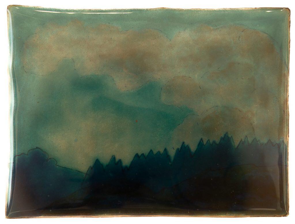 Das Werk von André Evard (1876-1972) ist eine Emaille Arbeit, die durch ihre nuancierte Farbigkeit und atmosphärischer Tiefenwirkung besticht. In einer rechteckigen Bildfläche entfaltet sich ein rhythmisches Zusammenspiel von organischen Formen und subtilen Farbverläufen, die zwischen Dunkelgrün, Petrol, Blau und warmen Erdtönen changieren.